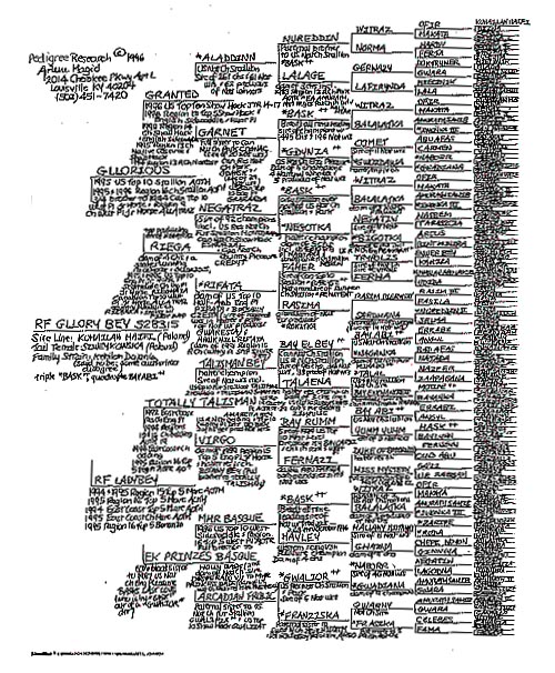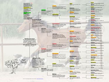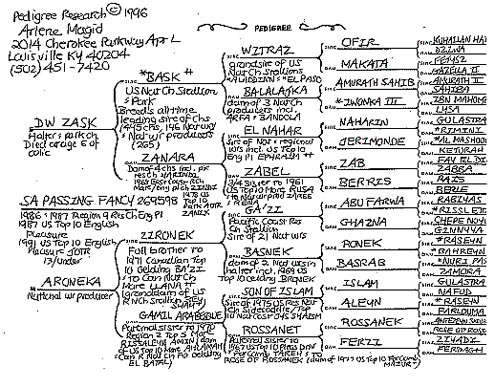 Hand-printed pedigrees are available with champion, endurance and/or race winning commentary under each ancestor's name. Research on family strains (done with colored underlinings on a pedigree) is also available and can be combined with the commentary under the names. All 8 generation pedigrees are on heavy stock and measure 14x17 inches. Please add $10 for postage if ordering a pedigree to be mailed to the U.S. as these are all hand printed and sent in the mail, not in email. Please note that the samples of hand printed pedigrees are scans of photocopies the originals are far more attractive and many clients frame the 8 generation ones and hang them on stall doors or in their homes.